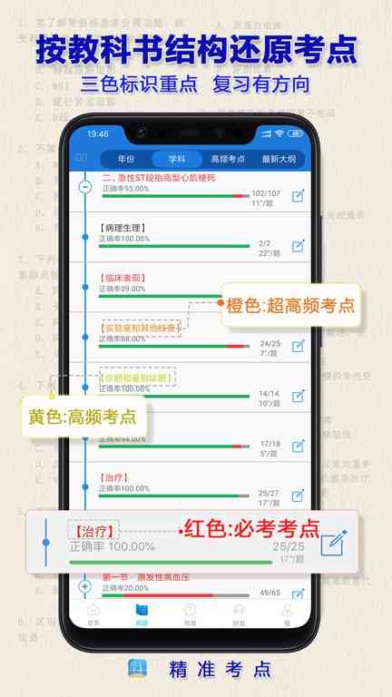 精准考点助理医师app致力于打造一个医学领域开放共享的终身学习交流平台,利用信息科技技术,整合全国有志为医疗事业发展的师资队伍,首创历年真题大数据分析,可视化视图呈现助理医师每年必考章节及高频考点。