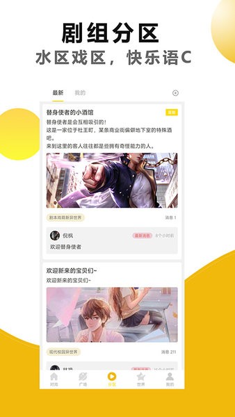 剧本戏是一款可以进行跑团演绎文游语c,的语言角色扮演软件,也是一款特别的、小众的社区软件。“你会喜欢上对皮么?”也许在这里你可以找到答案!
