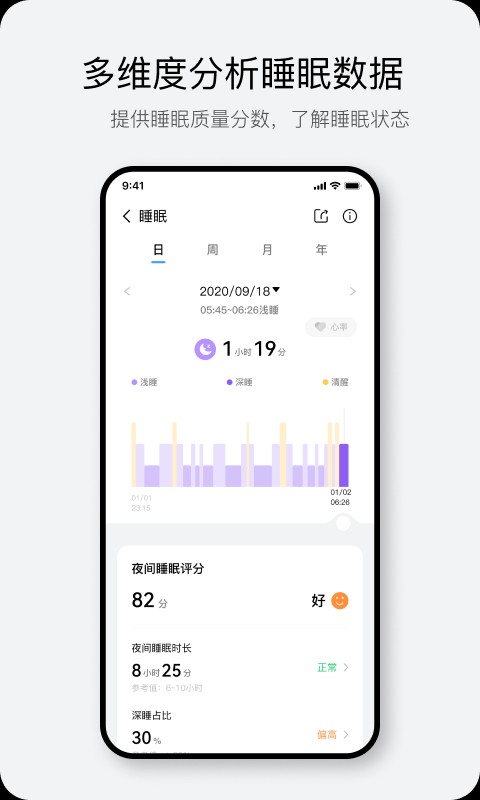 睡眠情况分日、周、月、年进行记录,用户能查看不同阶段的睡眠质量;
