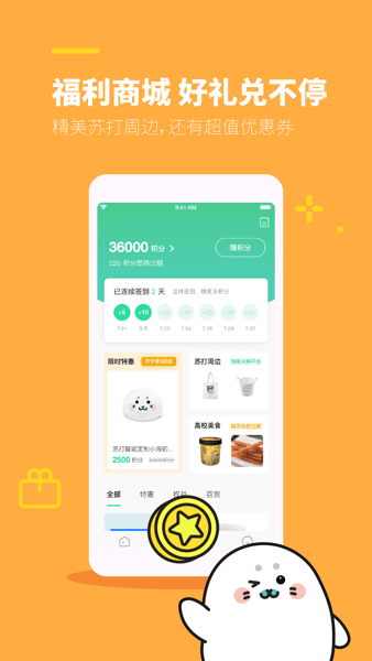 软件里还有福利商城,可以用积分兑换各种好东西,比如苏打周边或者优惠券。签到和打水都能赚积分,任务也很多,有时候还能领现金红包,挺吸引人的。而且设备是跟美的这样的大品牌合作的,质量应该有保障。