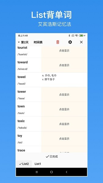 *「List背单词」:根据艾宾浩斯的记忆规律,第一天记忆单词,后续的复习间隔周期为:第1天,第二天,第四天,第七天和第十五天,并由此制作每日所需记忆的单词计划表。