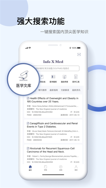 info x med app面向医疗行业的用户提供了医学知识分享服务。你可以在在这里搜索到优质的医学干货资源。数据权威可靠,实时更新热门数据。还可以在线查看用药百科等内容,并且为用户提供了贴心的医学计算器服务,欢迎体验。