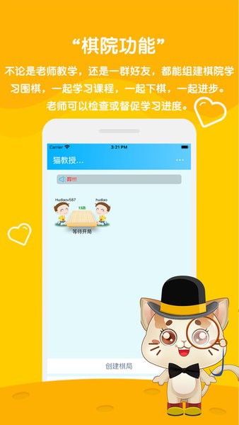不论是老师教学。还是一群好友。都能组建棋院学习围棋,一起学习课程,一起下棋。一起进步。老师可以检查或督促学习进度。