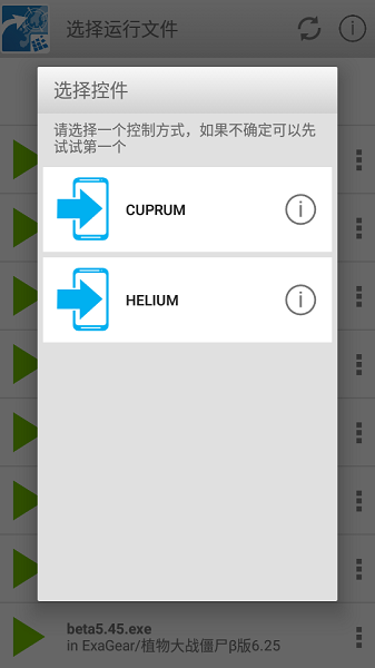 4、启动模拟器,如果正常,则进入选择运行文件列表,点击要运行的exe文件,选择一种操作模式,之后开始运行游戏,启动时间可能比较长请耐心等待;
