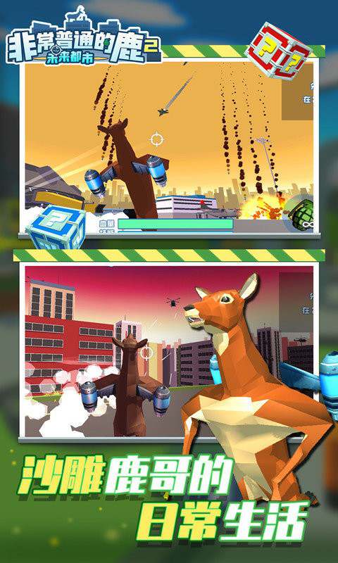 非常普通的鹿2未来篇手机版是为玩家带来更多的无厘头玩法的冒险手游,玩家将扮演一只疯狂的鹿,在游戏之中可以驾驶高达和使用各种未来的高科技武器在城市之中进行破坏。