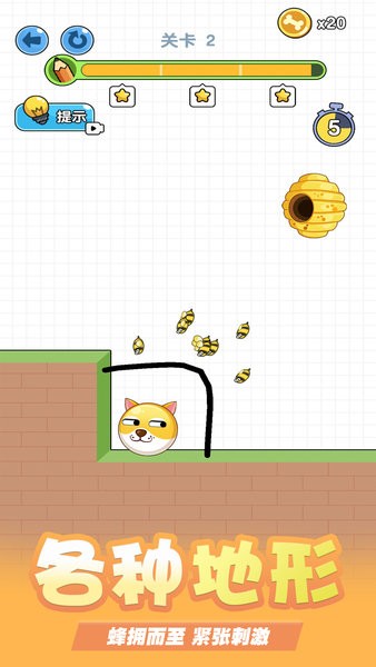 6、让狗头能快速摆脱危险区域,将所有蜜蜂都拦在外面,快速通关领取丰厚奖励。