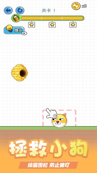 画线来救救狗狗的游戏,玩家需要画线来把蜜蜂隔离开来,这样就不能蛰到狗子了,相信很多的玩家也是玩过类似的游戏,可以说还是很魔性的,你能在所有的关卡中来拯救你的狗狗吗,一起来完成你的狗狗救援任务吧,你就是这里的狗狗救援大师。