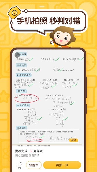 2.拍照检查,秒判对错:只需对练习拍照,一秒就能帮您判断对错,并进行针对性的分析辅导,让孩子“知错能改”;