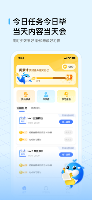 鲸鱼爱学官方版由原来的鲸准练app升级改名而来,帮助大家轻松养成良好的学习习惯,可以制定目标任务,学习旅程更加清晰,一目了然,每日打卡计划,高效学习练习,还提供学习报告数据统计分析,掌握学情结果,针对性提升!