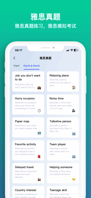 -- 精心准备的雅思真题及全面的雅思口语模拟练习,让您在实战前就能经历无数次的模拟考验,仿佛身经百战,轻松应对考试中的各种挑战。