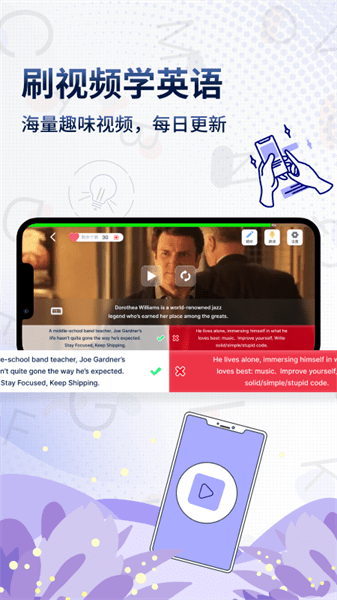一句英语APP的设计初衷就是努力做到高效和趣味的完美平衡。通过提取大量美剧电影TED等地道素材的对话,配合视频的趣味场景,结合欧美母语者撰写的小测试题,让你轻松坚持精听,刷着视频就能掌握英语。