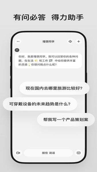 理想同学手机版最新版是一款理想汽车旗下的人工智能ai聊天软件,具备强大的功能,不仅支持知识问答、语句翻译以及文本生成,还具备视觉感知能力,边看边学,十分方便,可以满足个性化需求,语音输入十分快捷,操作简单,随时随地想用即用!
