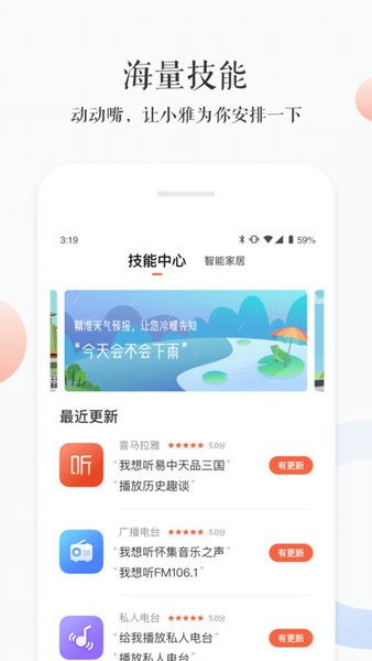 小雅智能音箱app是配合小雅AI音箱和Nano音响使用的手机软件,让你可以通过手机或语音轻松控制音箱设备,比如听书、点播内容,还能远程遥控家电,非常方便实用。喜马拉雅出品的小雅系列音箱集成了智能语音交互和海量音频资源,还支持天气查询、闹钟设置、情感聊天等功能,功能强大。