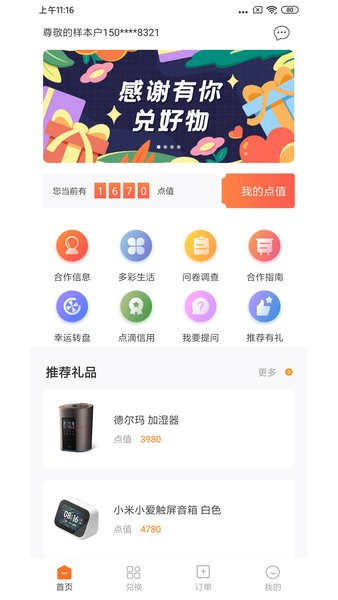 2.五个专栏,可以查询积分、承兑礼品、参与调查、上传图片,并能通过交流空间留言。