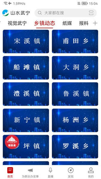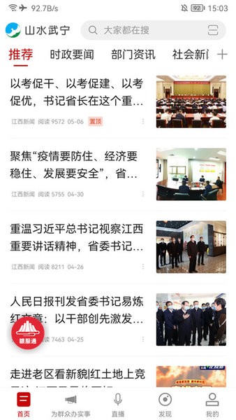 山水武宁客户端是为用户带来权威的本地资讯,软件整合了武宁县所有的媒体资源,让用户可以在软件之中观看到本地的新闻直播、报纸、微博等多种官方媒体的资讯。