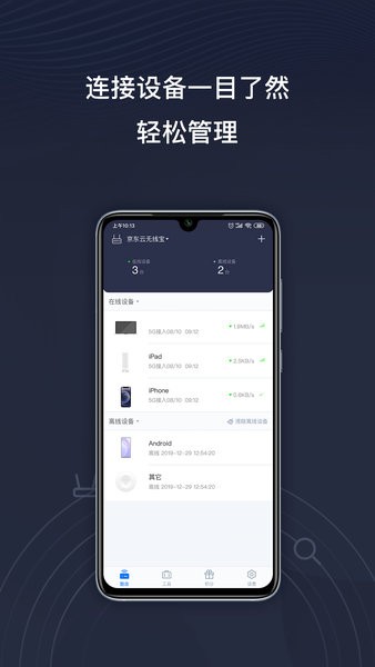 京东云无线宝app即为京东云路由器app,手机就可以轻松管理路由设备,支持一个账号绑定多个路由器,轻松管理每一个设备,商务状态随时查看;还可以对连接的设备进行控制,比如限制网速;可以一键踢出蹭网的用户。
