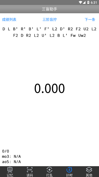 计时界面手指左右横扫会生成新打乱,上下竖扫会临时变成手动输入成绩模式。计时界面故意没有显示打乱图案,那是因为既然是盲拧,就有必要避免偷看打乱后的状态,如果实在想看,可以在计时设置里面设置显示打乱图案。