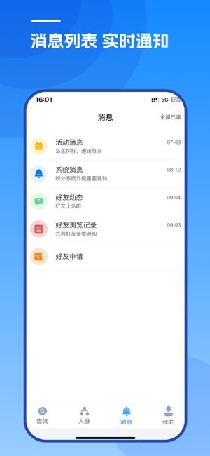 为了确保用户能够及时了解最新的动态与机会,我们特别设置了消息列表功能。在这里,您可以查看到所有与您相关的通知与提醒,包括新的人脉推荐、合作意向、活动邀请等。消息列表将实时更新,确保您不会错过任何重要信息,让您的商业活动更加顺畅无阻。