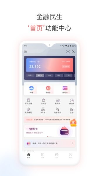工行服务智能提醒:根据您在我行的资产状况,为您智能推荐低风险理财产品,随时查看信用卡账单和还款信息