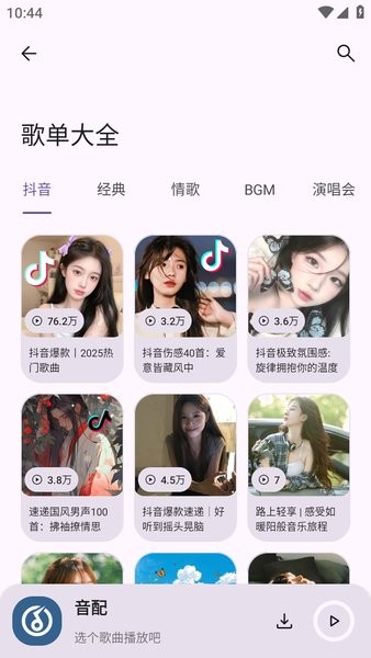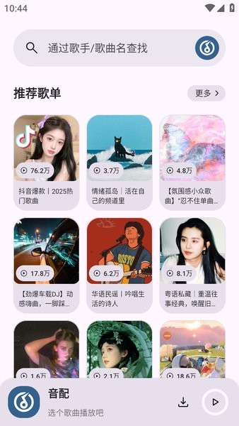 音配app功能强大,拥有海量曲库,涵盖各种音乐类型,并实时同步主流音乐平台的热榜和新歌资源。它不仅提供多种音质选择,还支持多种音频格式下载。此外,软件还有强大的歌词搜索功能和AI声纹匹配技术,帮助用户快速找到想听的歌曲。
