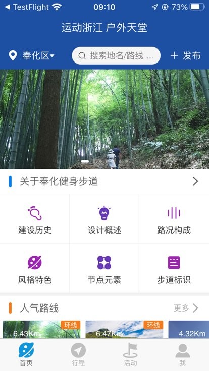 环浙步道手机版是提供户外运动健身服务的应用软件,介绍健身步道有关建筑历史、设计概述、路况构成、风格特色、步道标识等信息内容,还提供人气路线、行程推荐,实时记录足迹;历史,参与相关打卡运动活动,体验自然人文和体育旅游的乐趣!