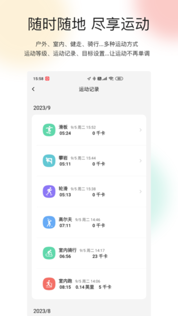跑步、步行、骑行、爬山等多种运动方式,运动等级、运动记录、目标设置等,让运动不再单调。