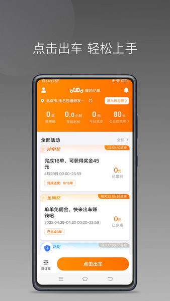3、自由接单,每个司机可以在这里自由决定出车与收车的时间。