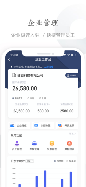 能链企服加油软件是一款为能链集团旗下企业公司提供能源管理服务的应用平台,不仅可以在线搜索查询附近的油站,了解详情,方便用油,还可以统计加油量和金额,帮助管理员工、管理车辆、管理发票,查看数据报表信息,解决财税问题,高效办公!