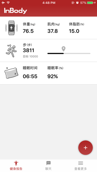 主页面板显示InBody、运动等各个项目的主要指标,易上手好操作。
