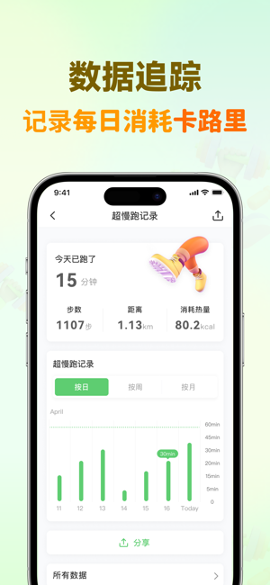 你只管跑,数据交给我们,每次慢跑都会帮你记录步数、公里数、消耗的卡路里、跑步时间。