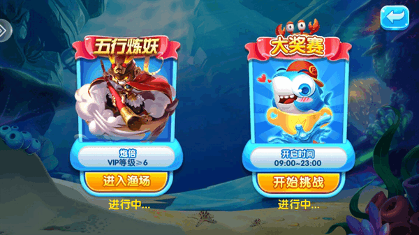 -万倍火力的炮台对鱼群进行轰炸,更畅快的爆炸体验,四个不同的级别的房间,使用不同倍率的炮台捕鱼。房间越高级,可用的炮台倍率越大,捕鱼时获得分值也越高。