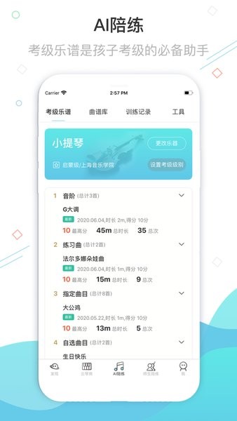 涵盖所有西洋乐器的在线智能练习app,帮助4~16岁青少年器乐练习, 给予他们专业的练习指导;也是考级辅导的必备助手