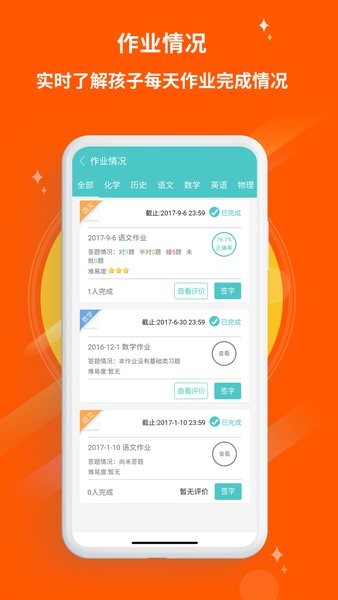 作业情况,查看孩子的作业完成情况,便于更好的监督孩子完成作业;