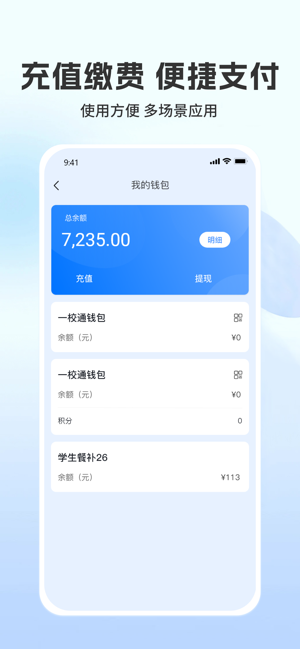 菁彩校园软件是提供校园生活管理学习的应用平台,让你的校园世界更加精彩。最新消息实时通知提醒,我的待办日程任务轻松处理,订单信息实时记录,一目了然,支持一卡通服务,智慧通行,在线充值缴费,还提供学工业务工作办理管理,好用实用!