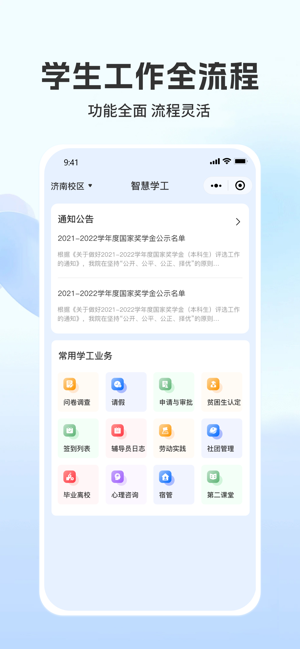 融合信息、通讯、办公、管理、协作、生活、服务、学习等领域,构建高效、适配、体验、开放、整合的移动校园门户。