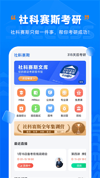社科赛斯考研app,一款专门为广大的考研族的人们打造的教育机构软件,平台上有大量的课程资源提供给大家学习了解,也有专业的老师直播授课,为用户带去了详细且全面的学习内容,让你直接在手机端就能进行系统化的复习,有需要的朋友快来下载用起来吧~