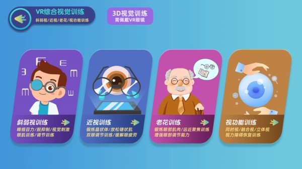 贞视力训练游戏是一款提供视力训练服务的应用平台,支持斜弱视训练、vr斜弱视训练、vr综合视觉训练等功能,各种任务等你挑战,搭配vr眼睛设备使用,身临其境,训练实力视觉,针对性检测治疗,还提供教程指导,使用方便简单!