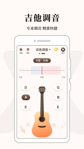 吉他调音器手机调音是有着丰富的调音器设置的吉他辅助工具,大家可以按照操作设置足够多的服务来完成对吉他的矫正,细节显示出吉他的详细音质和信息,大家按照操作来设置专业的服务设置吧!