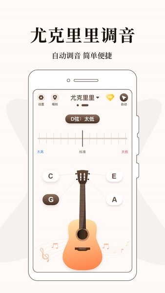 专业的吉他、尤克里里调音工具, 这是一种简化的吉他调音器,可以快速,轻松地调音,绿灯行,蓝灯红灯调,零基础也能学会,多种学习模式,乐谱、指法、音准多方面训练。
