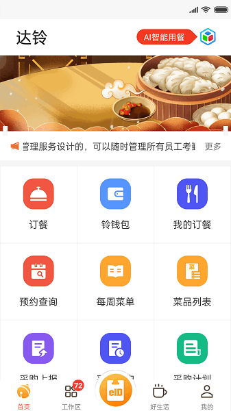 达铃,专业的在线订餐软件,通过app,用户可便捷在线订购自己的餐点,实现更高效的业务运营,软件提供的订餐模块功能十分方便,软件集合用餐管理与企业办公服务等功能于一体,有需要的用户可以下载使用!