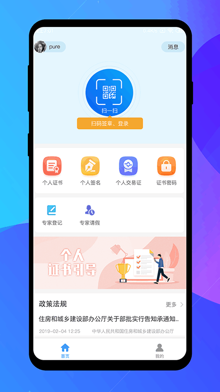 专家签APP,提供开通专家个人证书服务,通过使用手机扫描二维码来完成注册、登录、签名、验签等业务流程,为专家远程异地评标签字提供解决方案。