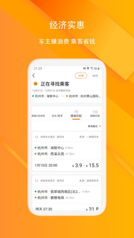 1、实行智能行程匹配,让顺路的车主和乘客实现共享车辆出行。