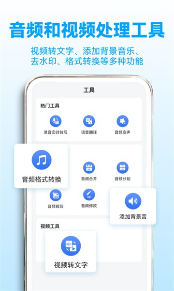 给现有音频文件添加背景音乐,可调节音量等;支持手机本地音乐导入添加