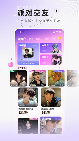 温暖交友:用户可以通过在线实时语音与志同道合的人进行交流,享受温暖的陪伴。