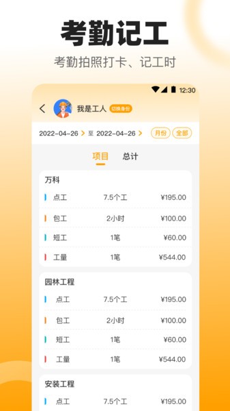 轻松记录每个项目及工友的考勤工时,让工地管理、工程管理、项目管理、考勤管理更轻松。统计生成汇总表,一键生成考勤表,便于核对工时。
