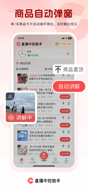 直播间商品自动讲解、调序、置顶、上下架,一键设置本场搭配、本场主推