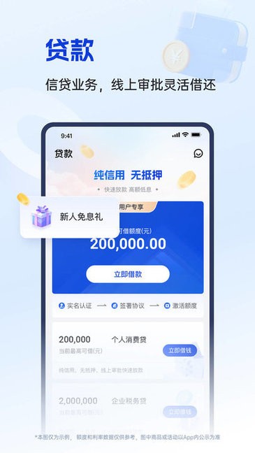 我们追求简约而不简单的设计理念,以“首页、财富、贷款、生活、我的”为主线,分类明确、操作便捷,为您提供最舒适的视觉享受和最流畅的操作体验。