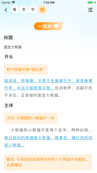 提供写作架构,搭配旁批注解,素材智能替换,降低写作难度,帮助孩子快速写成一篇高分习作