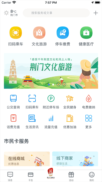 “荆门市民卡”APP是整合公交、停车、缴费、旅游、教育、文体、医疗、商城、公共便民服务等功能,构建线上线下无缝对接的多卡融合综合性服务平台。