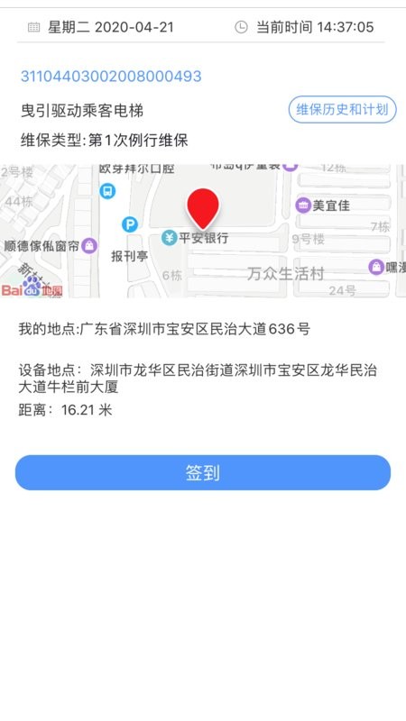 供电梯维保人员现场作业使用的手机app软件,维保人员通过app的任务提醒功能可以对每天的维保任务一目了然,维保人员到达现场后在app上进行维保签到,并将维保记录、故障记录在app上进行保存,为维保单位对电梯维保质量管理和决策分析提供数据支撑。